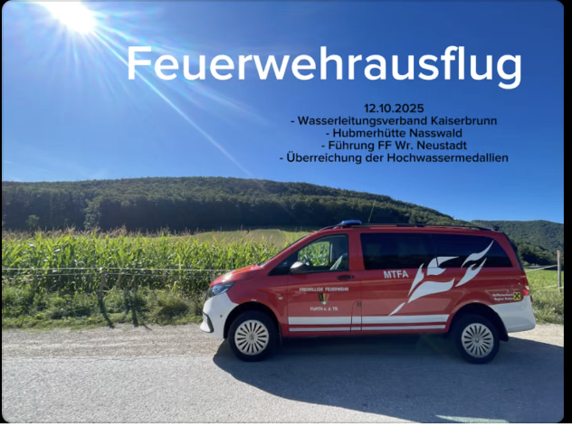 Am 12.10.2025 fuhr unsere Feuerwehr gemeinsam mit Angehörigen auf den Feuerwehrausflug 2025. Das Programm: 1. Wasserleitungsverband Kaiserbrunn 2. Hubmerhütte Nasswald 3. Führung in der Freiwilligen F…