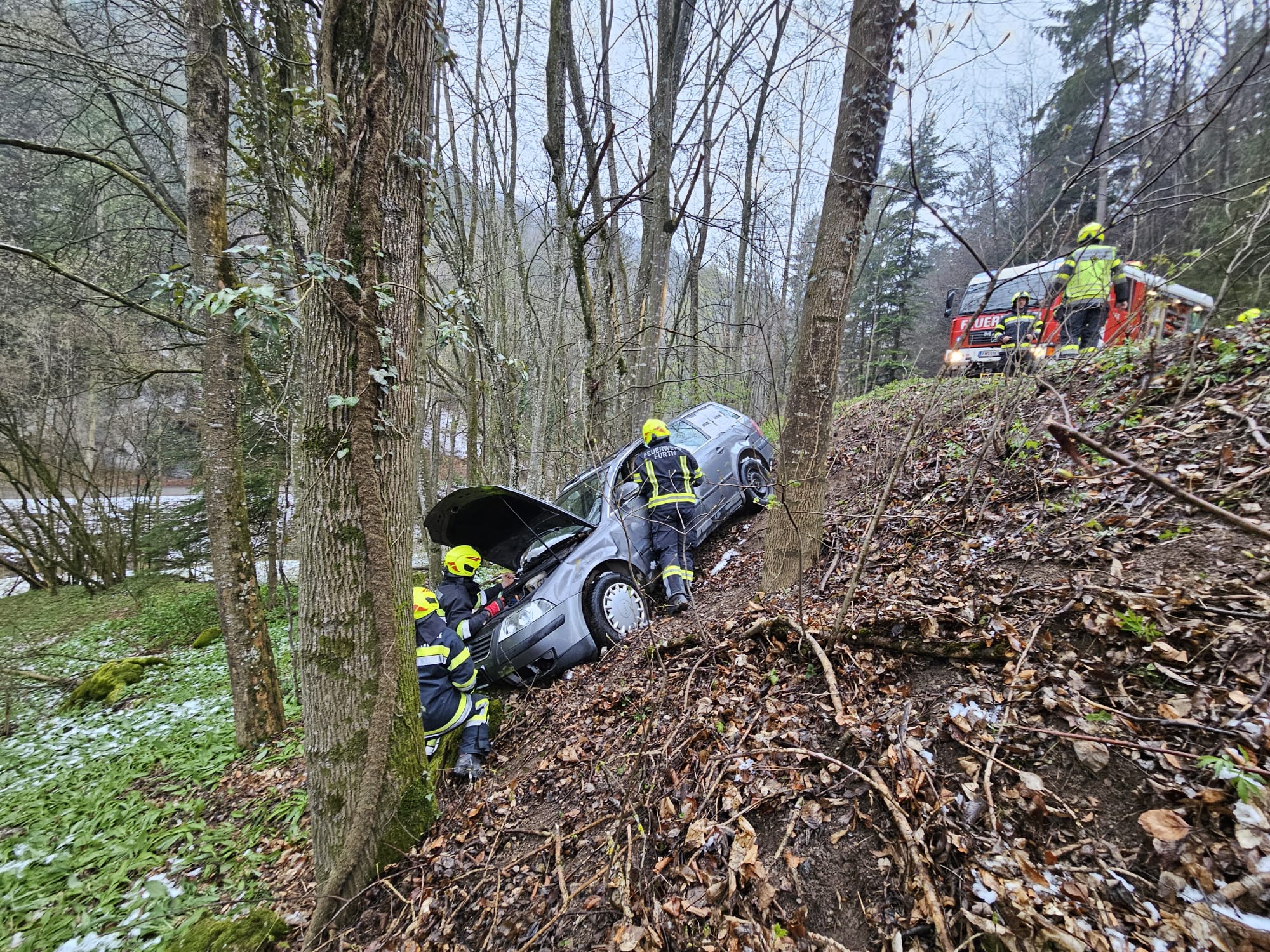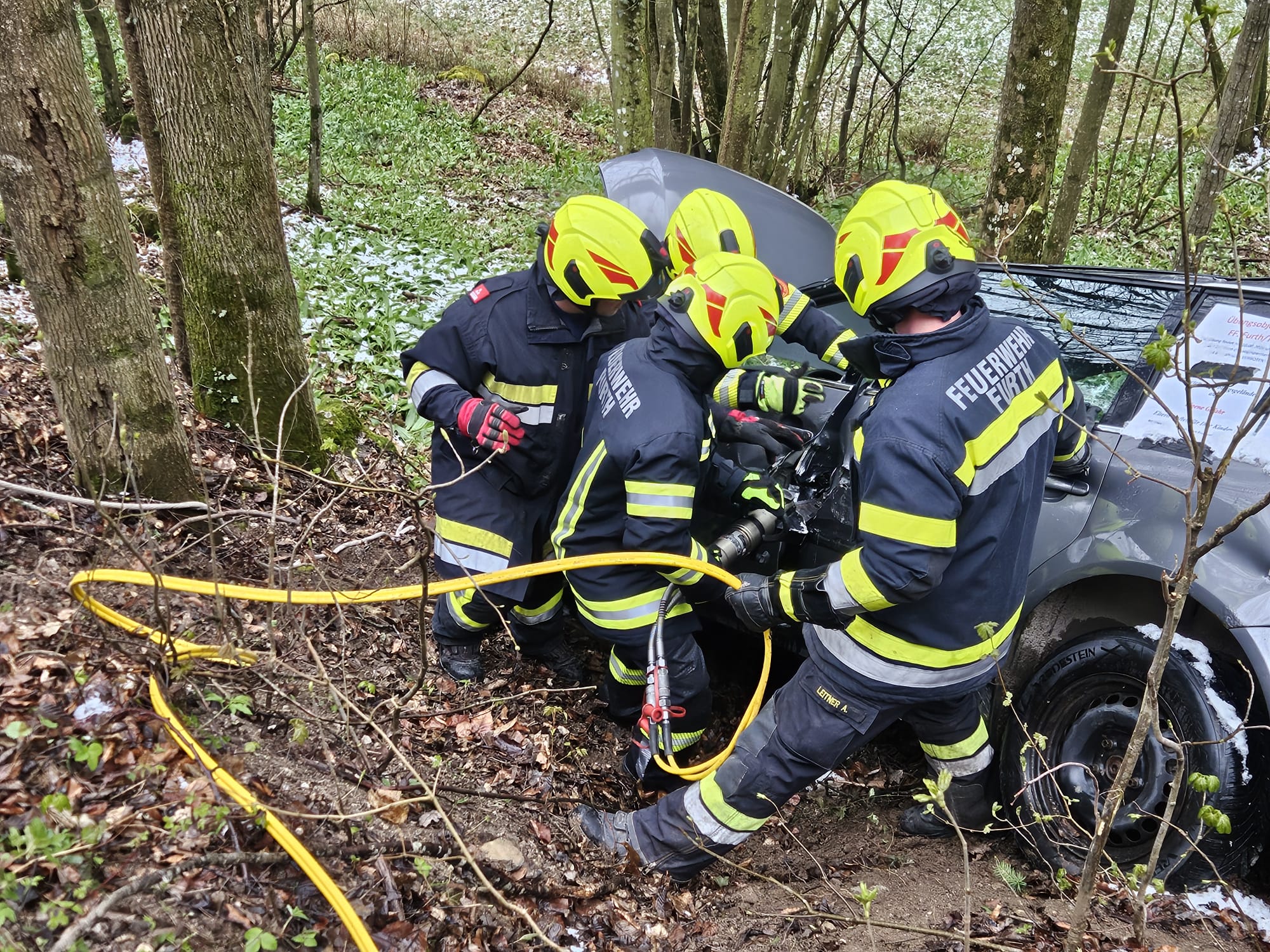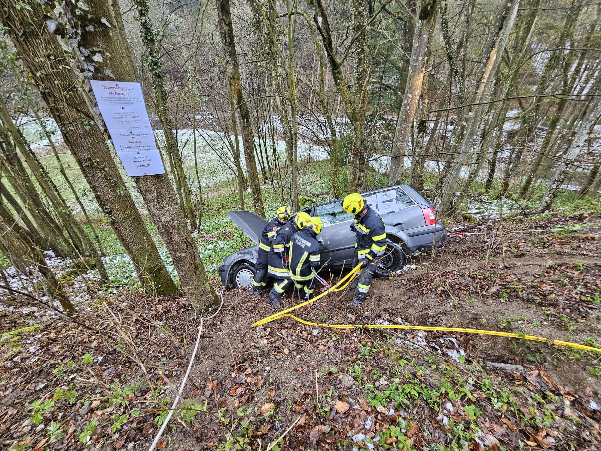T2 – PKW vom Weg abgekommen, eine eingeklemmte Person.